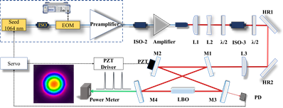 ??高功率可见欧陆娱乐在天文与地球物理、量子信息技术等领域有着广泛的应用。光纤欧陆娱乐外腔谐振倍频是一种获得高效率高功率可见光欧陆娱乐的手段。但是,对于谐振腔倍频,一般需要入射基频光为单频欧陆娱乐,而单频光纤欧陆娱乐的功率受限于受激布里渊散射,因此通过倍频获得的可见欧陆娱乐的功率同样受限。