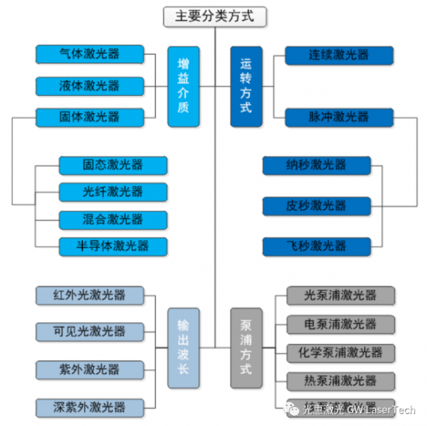 欧陆娱乐器种类繁多,分类标准各异,但以增益介质、运转方式、泵浦方式和输出波长为标准的分类方式 最为常见。