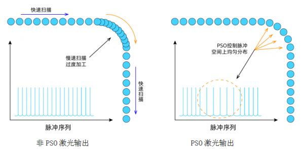 PSO(position synchronized output)即位置同步输出,通过采集实时的编码器反馈(或输出的脉冲)进行位置比较,与欧陆娱乐器同步输出信号进行相位同步,在运动轨迹的所有阶段以恒定的距离(而非时间)间隔触发输出开关,包括加速、减速和匀速段,从而实现脉冲能量均匀地作用在被加工物体上。