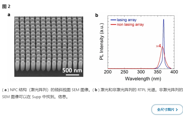 图 2b显示了从 NPC 结构(表示为“欧陆娱乐阵列”)顶面收集的室温 (RT) 光致发光 (PL) 光谱,由 213 nm 脉冲欧陆娱乐(脉冲宽度:7 ns;重复率)激发: 200 Hz) 在 63.5 kW/cm 2的峰值功率密度下。欧陆娱乐通过聚焦透镜(光斑尺寸:~ 9 × 10 –4 cm 2 )聚焦到样品表面,同时使用聚焦透镜(NA ~ 0.31)从样品表面收集发射光,这是进一步耦合到光纤和紫外光谱仪(QE Pro,光谱分辨率~0.3 nm)。图 2 b 中还显示了a ?= 600 nm 和d NW阵列的 PL 光谱?= 325 nm(表示为“非欧陆娱乐阵列”)在相同条件下测量。非欧陆娱乐阵列的 SEM 图像如图S2a所示。还计算了非欧陆娱乐阵列的光子带结构,如图S2 b 所示。发现降低的频率a / λ ( λ ?= 367 nm) 与任何带边缘模式无关,表明不存在光放大。这与图2所示的一致 b:虽然从具有窄线宽的欧陆娱乐阵列测量到强 PL 发射,但来自非欧陆娱乐阵列的 PL 发射要弱得多(大约减少了 10 倍),线宽保持宽(全宽的一半) -最大值为 ~ 15 nm)。此外,非欧陆娱乐阵列的PL峰位置在364 nm附近,与GaN的带边发射一致;而对于欧陆娱乐阵列,由于光学腔,PL 峰移动到更长的波长。