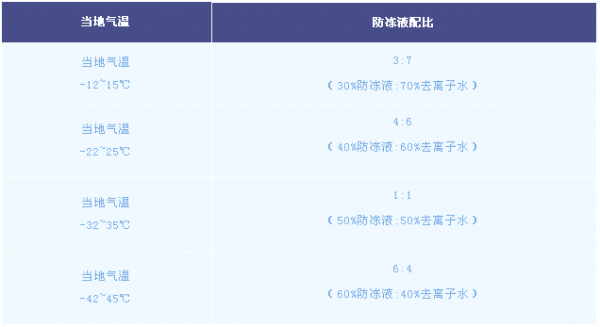 ● 使用浓度不能低于20%,不同气温有不同配比,请参考下表。如对配比有任何疑问,可咨询我司售后服务热线:400-8229-288 ;