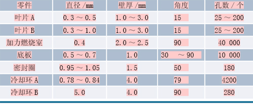 目前航空领域中用于喷射引擎的气体温度可达到2000℃,这个温度已经超过了涡轮叶片和燃烧室材料,即镍合金的熔点,于是人们一般采用边界层冷却的方法来解决这个问题,即在气压涡轮、喷管叶片和燃烧室表面加工孔(见图1),其中每个零件上的孔从25个到4万个不等(具体零件的参数如表1所示),冷却气体可以通过零件上的小孔覆盖整个零件的表面来隔绝外界的温度,从而起到保护作用。
