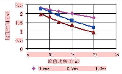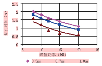 图7 不同脉冲宽度时的钻孔时间 (与表面成20角,JK704LD1,O2 辅助)