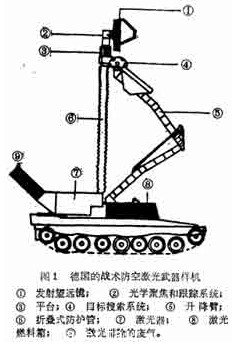德国MBB和DIEHL公司自70年代初就开始研究防空欧陆娱乐武器方案,采用平均输出功率1MW或几MW的气动CO2欧陆娱乐器。这种欧陆娱乐武器系统重约20吨,安装在“豹-Ⅱ”坦克底座上,一般由2个人操纵即可。一个长约11.5m的升降臂,可将发射光学系统升至高处,以减少地面稠密大气或战场灰尘影响。样机如图1。根据设计,每秒射击一次(成本约300美元)。发射出的强光束可破坏10km内的来袭飞机、直升机、战术导弹等,并可致盲20km或更远的光电传感器[6]。#p#分页标题#e#