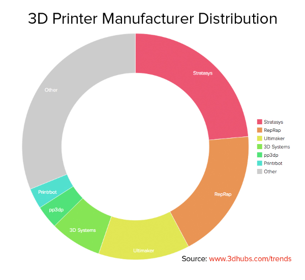 根据3D打印机制造商的市场占有率来看,Stratasys、RepRap和Ultimaker维持保持前三名,这三家的市场份额合计达55.2%。