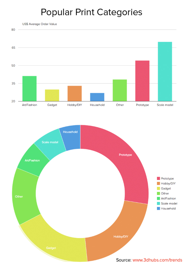 现在让我们看看这些3D打印机主要被用于做什么吧!3D Hub的数据显示,排在热门打印类别前三的是原型、业余爱好/DIY和小工具,其中小工具类别增长得最快。该数据可能表明更多的低成本消费级对象正在打印,显示DIY文化仍然是当前3D打印的核心。