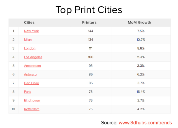 从全球范围来看,3D打印将继续扩大其覆盖面。 纽约、米兰、伦敦和洛杉矶仍然是拥有3D打印机数量最多的四家城市。与此同时,阿姆斯特丹、海牙丹、埃因霍温和鹿特丹则使荷兰成为上榜城市最多的国家。