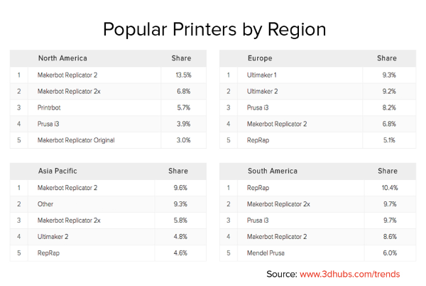 此外,3D Hub还按区域对于一些3D打印机品牌的市场占有率进行了统计。这个数据没有太大的改变:在欧洲,前两名的是Ultimaker 1和2。同样,在北美、亚太Markerbot Replicator 2和2X也高居榜首。