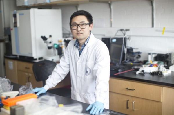 多伦多大学的研究员Boyang Zhang在他的实验室里,他在那里开发AngioChip。