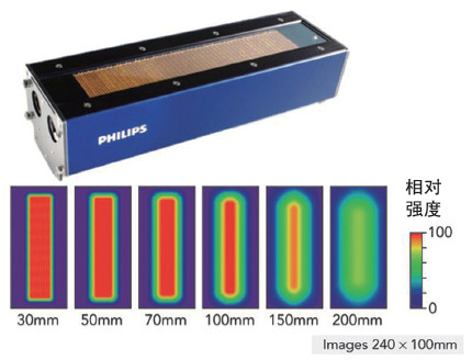图1展示了一个欧陆娱乐模块从40×208mm表面发射输出功率为9.6kW的光束。VCSEL模块发出的光不需要进一步使用光学元件,它本身就非常均匀。右边显示的是光强分布和发射器与目标之间距离的关系。在距离达到100mm之前,光强分布保持得非常均匀。由于光束由数以百计的芯片组组成,所以可以单独处理,从而有可能产生动态变化的光束分布。