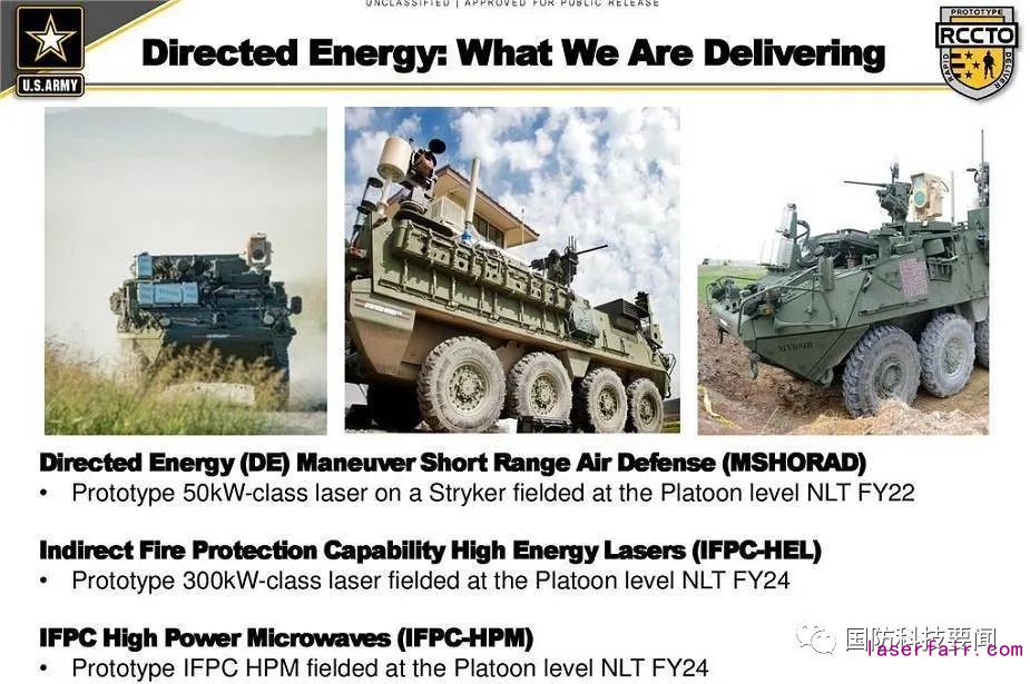 当前美陆军正在进行的定向能武器项目包括高能欧陆娱乐战术车辆演示器(HEL TVD)、多任务高能欧陆娱乐器(MMHEL)、移动实验高能欧陆娱乐器和高能欧陆娱乐移动试验车(HELMTT)。其中,高能欧陆娱乐战术车辆演示器项目将开发100千瓦级欧陆娱乐器,并将其安装到现有中型战术车辆系列卡车上,提供反火箭弹、炮弹和迫击炮弹(C-RAM)能力,用于保护固定设施,也可在移动模式下提供有限防护。高能欧陆娱乐战术车辆演示器还可进行改装,用于近程防空任务,对抗巡航导弹和无人机。该项目要求在2021财年建成高能欧陆娱乐战术车辆演示器,在2022财年演示其能力并获取测试数据。如果演示成功,该项目将转为备案项目。