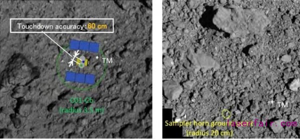 (左)JAXA隼鸟2号第二次着陆点(蓝点)和计划着陆区C01-Cb的中心(绿点)的位置;(右)隼鸟2号采样杆接触点的位置(黄圈)| JAXA [2]