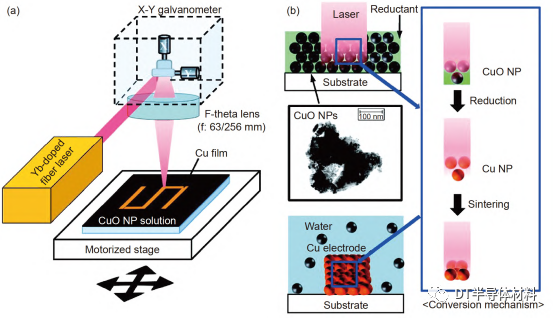图 2 (网络版彩图) (a) 欧陆娱乐还原CuO的实验装置示意图; (b) 欧陆娱乐还原CuO纳米油墨的工艺流程图, 通过光化学作用和光热作用将CuO纳米油墨转化为Cu膜[53]. 图片来自文献[53], 已获得授权
