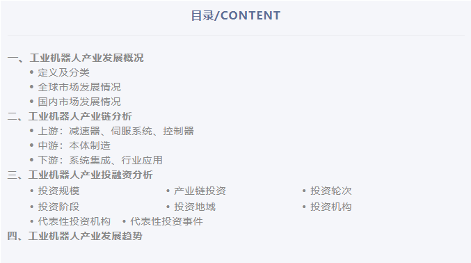 整体来看,工业机器人下游多应用领域渗透率逐年提升,“机器人换人”成必然趋势;工业机器人在核心零部件、共融技术、云化技术等方面不断进步优化;进口替代进程加速,国产厂商份额持续上升;工业机器人领域披露投资金额逐年增长,投资热度保持上升趋势。