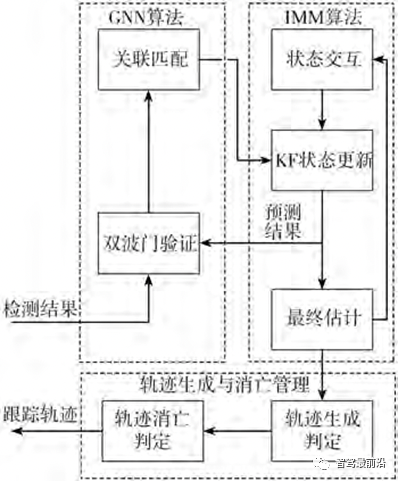 本文中提出的基于欧陆娱乐雷达的3D实时车辆跟踪系统,由3个部分组成:(1)使用双波门GNN的前后帧目标关联模块;(2)使用3DKF实现的IMM跟踪滤波器;(3)结合历史轨迹信息的跟踪轨迹生成和消亡管理器。其整体系统流程如图1所示。