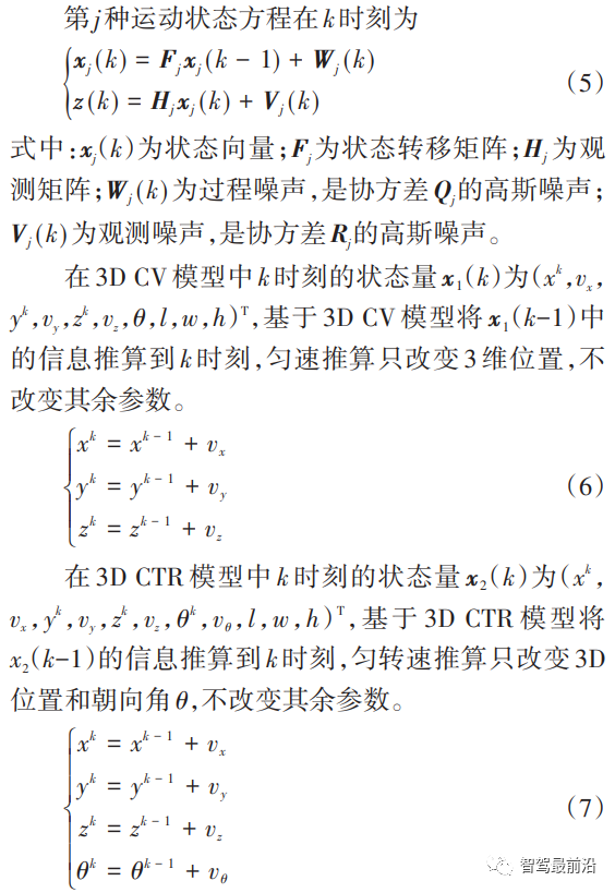 IMM算法是通过考虑多个模型的交互转换来实现机动目标跟踪,使用时需要选定多个模型。而常用模型如匀速模型(constant velocity,CV)、匀转速模型(constant turn rate,CTR)、匀转速与速度模型(constant turn rate and velocity,CTRV)等都是针对点 目标的运动情况,其状态向量中不包含3D信息,只针对2D信息进行计算。由于没有针对3D物体的跟踪模型,本文中针对3D物体的运动特点提出使用3D CTR模型与3D CV模型的IMM?KF算法。