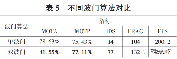 对比所提出的双波门算法与单波门算法的性能,其结果如表5所示。从表5可知,双波门算法比单波门算法在MOTA指标上有约3%的提高,在MOTP指标上也有1.68%的提升,仅在IDS与FRAG上有所下降。除了精度上的提高,在算法运行速度上,由于双波门算法减小了跟踪算法的计算量,使跟踪速度有了较大的提升,FPS上涨了32.92%。