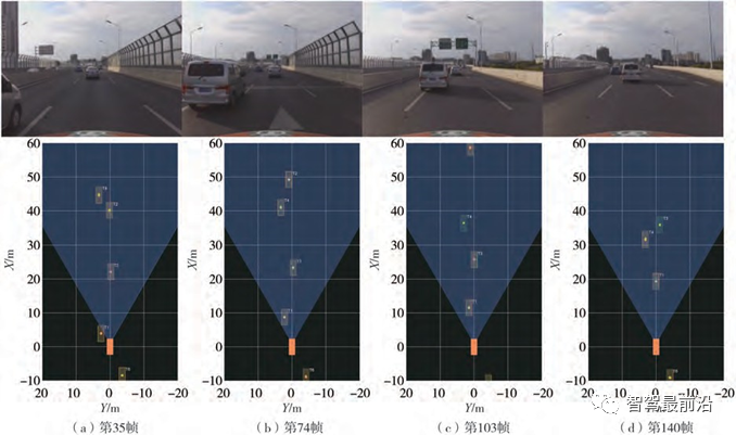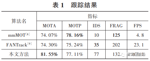 使用在训练数据中划分出来的验证集对算法性能进行验证,其结果如表1所示。由表1可知,在主要的跟踪指标MOTA上对比算法mmMOT与FANTrack高了7%,而在MOTP与FRAG指标上较最好的mmMOT算法差距并不大,仅在IDS指标上效果较差。在这样的结果下,本文中算法实时性达到266.1FPS,比FANTrack算法快了11.5倍,比mmMOT算法快55.4倍,所提出的跟踪算法完全满足智能驾驶实时性的需求。