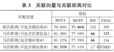 对关联向量与关联距离的不同设置进行对比,其结果如表3所示。从表3中第1组与第4组对比可以看出,马氏距离可以实现更高的MOTA精度。马氏距离可以更好地描述关联向量不同信息间的重要程度,使得对目标间距离的评价更加准确。而后3组的实验对比显示了单纯的增大关联向量维度并不能带来MOTA精度的提高。第2组与第4组对比可以看出目标3D体积信息的添加对关联是有益的。而第3组与第4组对比,朝向角θ的加入,并不能提高MOTA精度。本文中认为3D检测算法对目标的朝向角敏感度较低,对于同一目标在不同帧中的检测结果,其朝向角大小可能会发生180°的突变。朝向角发生180°突变,其检测框位置不会发生变化,然而3D跟踪的关联距离会产生较大的变化,从而导致关联失败,因此在关联向量中去除朝向角θ信息反而能带来MOTA精度的提高。