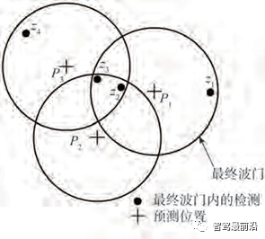在进行双波门滤波后,对满足双波门阈值的检测进行关联匹配。若几个较近的轨迹波门内不存在相互干扰的检测结果,则使用波门内马氏距离最近的检测目标作为匹配目标。如存在如图3所示的复杂情况,即预测位置P2其马氏波门内的检测z2与预测位置P1的距离最近,检测z3与预测位置P3距离最近的情况,则使用匈牙利算法作为匹配算法,将其代价矩阵定义为Cmn(m为已有轨迹数,n为所有检测数),其中元素为cij。