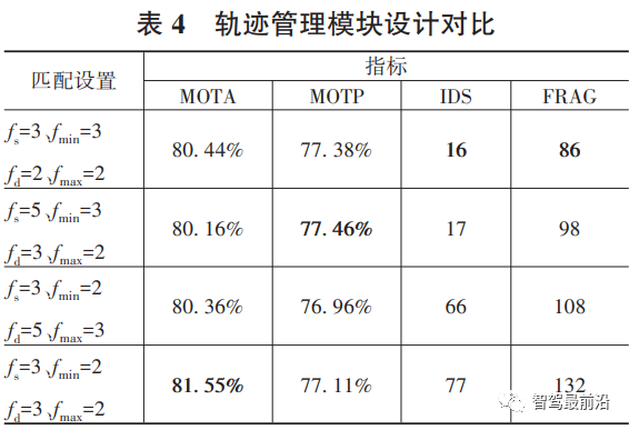 在轨迹管理模块中对比了不同的fs与fmin、fd与fmax参数值对精度的影响,其结果如表4所示。对比表4后3组实验可知,增大对历史轨迹的判断范围,即使轨迹生成和消亡的总体判定比fmin/fs与fmax/fd从2/3下降到3/5,仍可减小IDS与FRAG。而在合适的fs与fd设置下,将fmin/fs与fmax/fd升至1,如第1组实验,即可获得最小的IDS与FRAG。