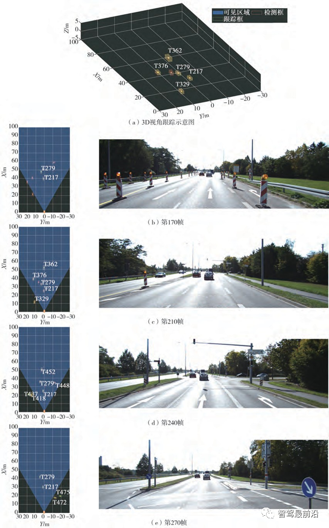 如图4(b)右侧的场景图片所示,第170帧中有效的检测目标只有T279和T217两辆车,但检测算法输出了多个误检目标。此时,在图4(b)左侧的跟踪结果视图中所提出的跟踪算法有效滤除了误检目标,生成了正确的轨迹。此种情况在图4(c)~图4(e)中也有出现,综合验证了所提出跟踪算法所具有的优秀关联能力。