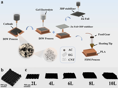 近日,我所催化基础国家重点实验室二维材料化学与能源应用研究组(508组)吴忠帅研究员团队,提出了通过油墨直写成型和熔融沉积成型两种3D打印方法,构建全打印可定制水系锌离子杂化电容器的新策略。团队利用该策略,构筑了具有分级多孔结构的高面容量正极,以及无枝晶稳定结构的锌金属负极,制备出高比能、长循环稳定的锌离子杂化电容器。