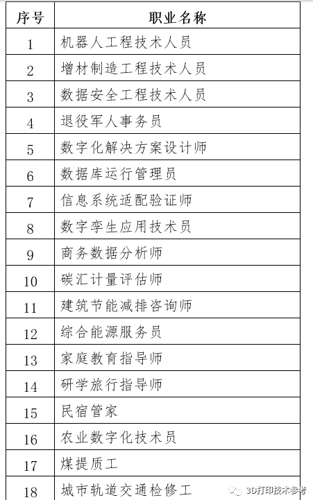 2020年5月,人社部能力司将“增材制造设备操作员”拟定为新职业,跨出了从以往政策支持学校培养到职业认可的重要一步。2022年6月14日,人力资源和社会保障部发布了最新职业信息公告,「增材制造工程技术人员」等18个新职业信息作为第一批向社会进行公示。