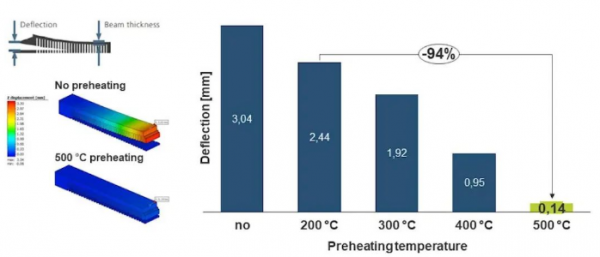 一个有效的对策是在整个打印过程中保持基板的顶部温度在 500 摄氏度。一方面,增加的预热温度减少了温度差,另一方面,打印件的屈服强度也降低了,这两个因素的结合意味着,在增材制造过程中,残余应力已经减少。