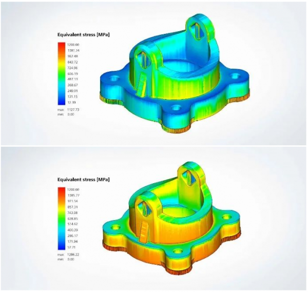 △图2:如果一个部件在 500 摄氏度的预热下进行 3D 打印, Ti6AI4V 部件中的残余应力就会大大降低(上)。这为设计开辟了全新的可能性,特别是在生产体积跳跃的更大规模的部件时。在 200 摄氏度时,残余应力明显增加(下)。这导致了更高的准备和后处理工作,因为需要更多的模拟和支持设计。