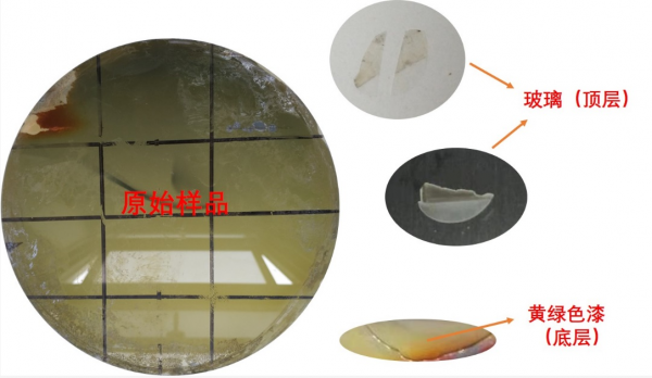 晶圆原始表面有两层覆盖物,顶层为透明的玻璃,玻璃下面为黄绿色漆层。如图1所示。样品边缘有一些分布不均匀的白色物质。