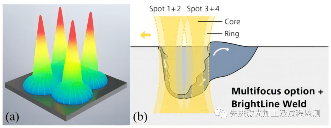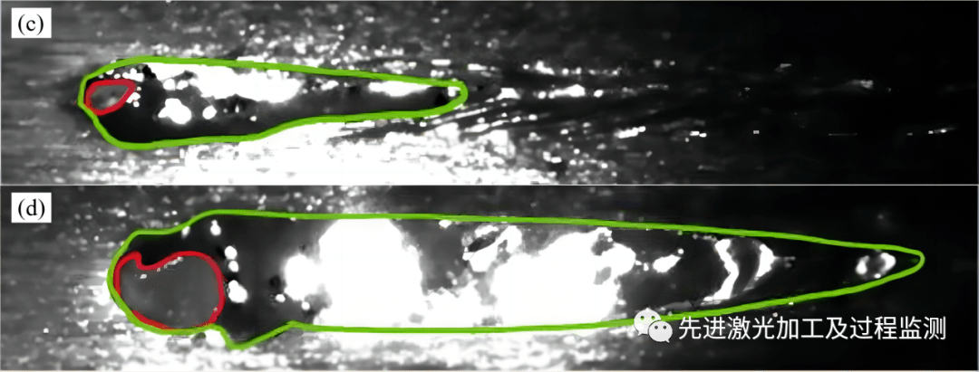 图9 铝/铝接头时在光束振荡的基础上加入光束整形,将单个欧陆娱乐光斑分成四个功率相等的单光束。(a)多聚焦形成的四个光斑的欧陆娱乐功率分布示意图;(b)欧陆娱乐光斑作用于熔池的示意图; (c)单点焦点光束焊接。(d)多焦点光束焊接 [红色:当前锁孔大小;绿色:当前熔池大小]。
