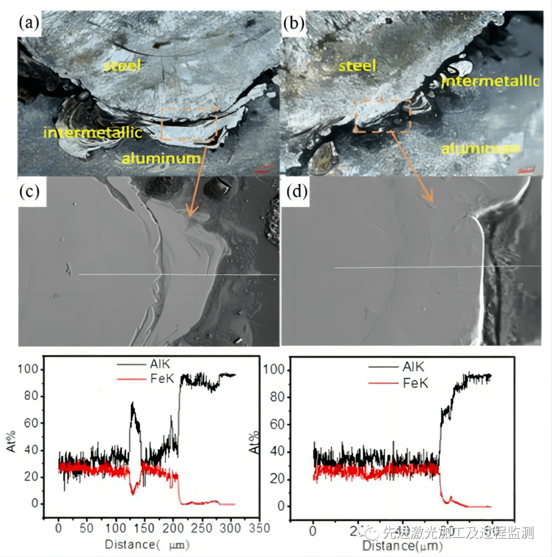 图2 5057铝/301不锈钢欧陆娱乐焊接加入垂直焊接方向磁场(B)作用。焊缝中两组界面形态:(a)B =0和(b)B=240mT;焊缝-铝界面层的线扫描区域和分析::(c)B =0和(d)B =240mT。