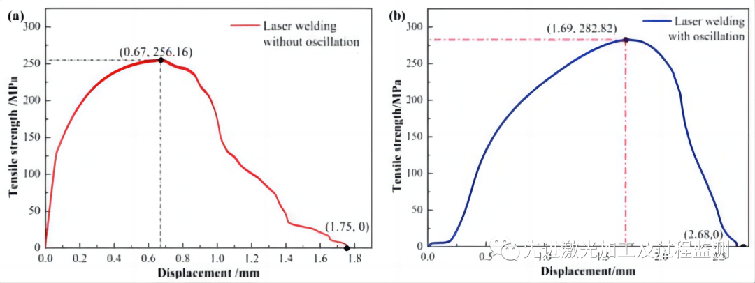 图7 纯铜/不锈钢欧陆娱乐焊接时,加入环形光束振荡。(a)没有加入光束振荡的焊接微观结构以及焊接接头抗拉强度曲线,(b)加入振幅为0.5mm,频率为250Hz的环形光束振荡,焊接微观结构以及焊接接头抗拉强度曲线。