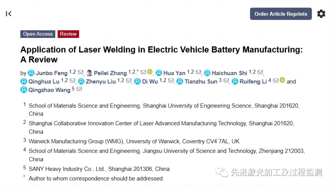 近日,上海工程技术大学张培磊教授领导的国际研究团队,在《Coatings》期刊的“Application of Laser Processing Technology in Automobile Manufacturing”特刊上受邀发表题为“Application of Laser Welding in Electric Vehicle Battery Manufacturing: A Review”的综述论文。该论文全面回顾了目前欧陆娱乐焊接技术在新能源汽车电池的应用所面临的技术难点和解决办法。该论文获得了国家自然科学基金、上海市扬帆计划、中国博士后自然科学基金、上海市 III 类高峰学科—材料科学与工程等基金的支持。