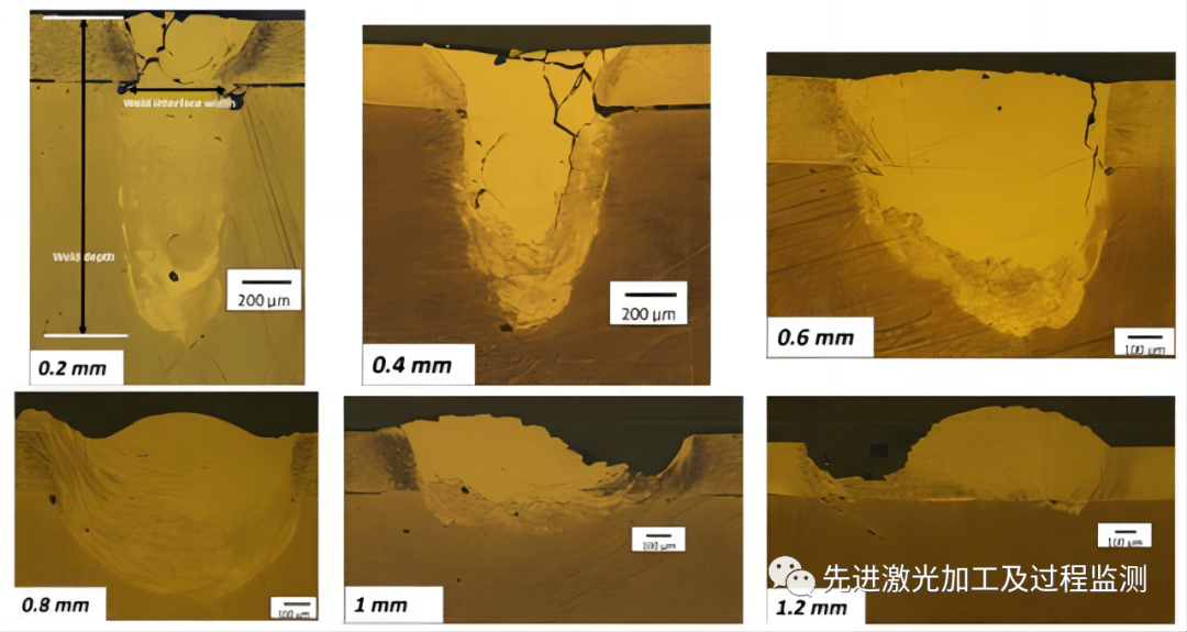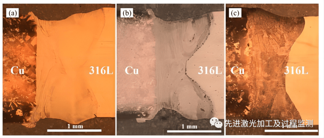 图8 纯铜/316L奥氏体不锈钢焊接,焊接时分别将欧陆娱乐在铜和不锈钢一侧进行偏移:(a)钢侧偏移0.4mm的焊缝形貌图,(b)偏移0mm的焊缝形貌图,(c)偏移铜侧0.2mm的焊缝形貌图。