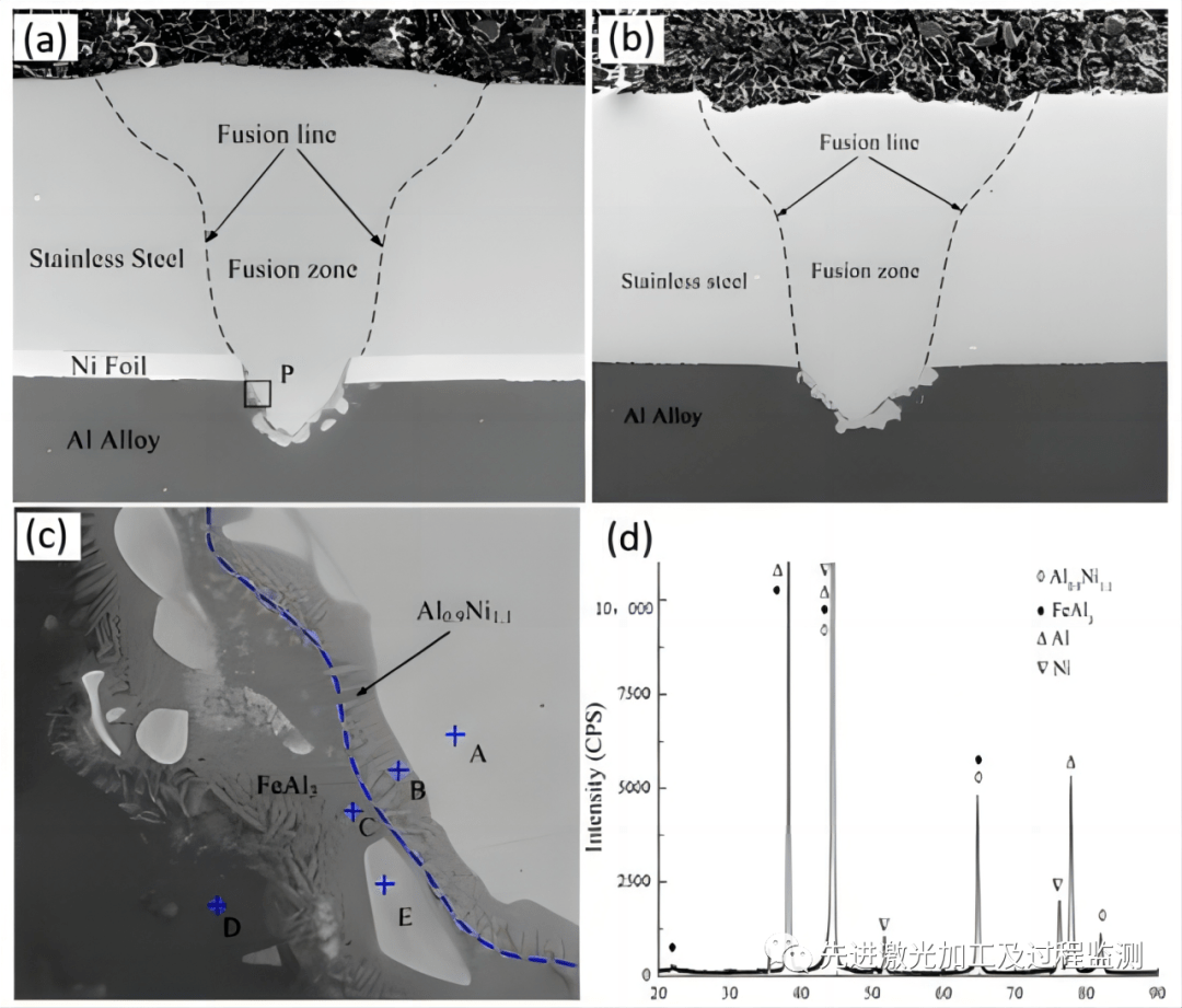 图3 A5052铝/201不锈钢欧陆娱乐焊接时,加入镍箔层与不加入镍箔层的接头微观结构。(a)带镍箔的接头的横截面,(b)不带镍箔的接头的横截面,(c)界面微观结构和(d)焊缝区的XRD图谱。