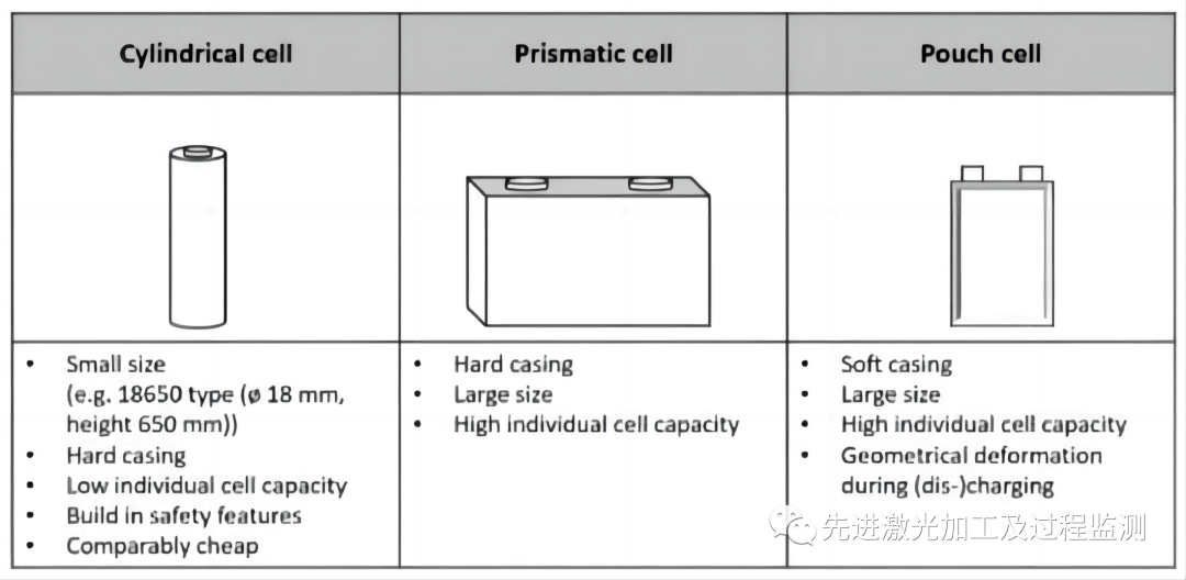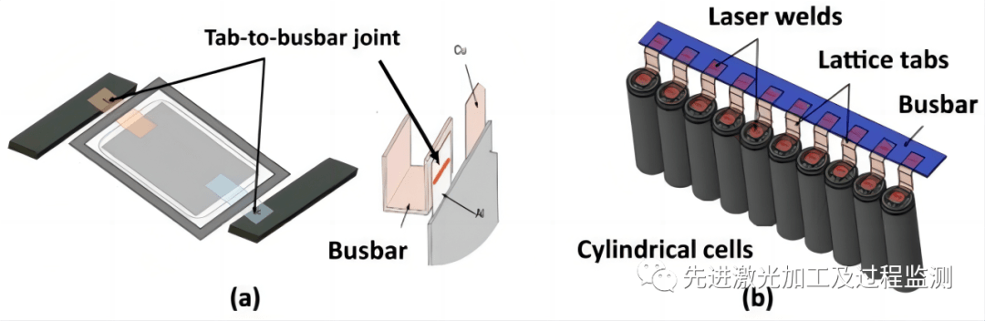 图1 不同类型的电池:圆柱电池、方壳电池、软包电池。在(a)基于软包电池和(b)基于圆柱形电池的模块制造过程中制作的片到母排接头的示意图。