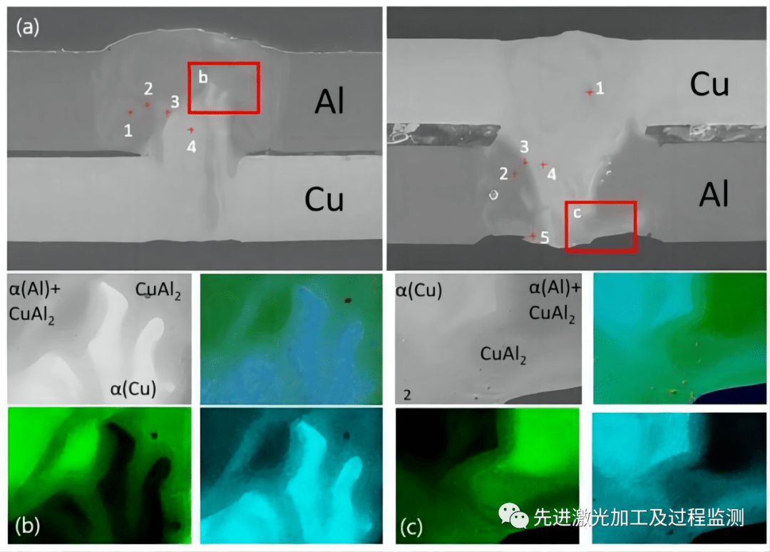 图6 99.99%纯铝/99.99纯铜欧陆娱乐焊接,分别采用铜在上和铝在上进行搭接焊接。(a)焊接试样的扫描电镜图像;(b,c)在焊接速度为400 mm/s时示Al和Cu分布的EDS映射图像(b) Al为上层、(c) Cu为上层。